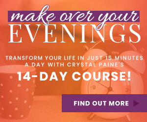 A 15–20 minute evening reset prevents tomorrow’s chaos. Crystal Paine’s Make Over Your Evenings program was a game changer.